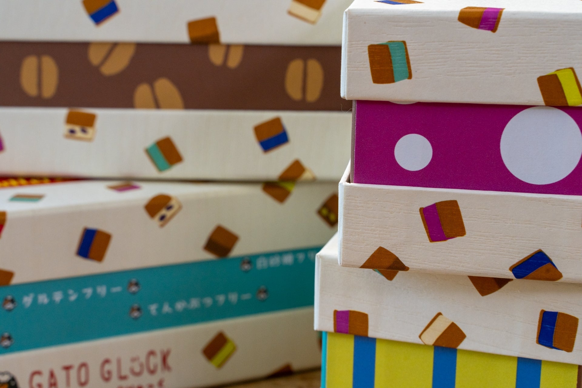 カラフルなバターサンド柄と、店長“がと君”がちりばめられたパッケージは、